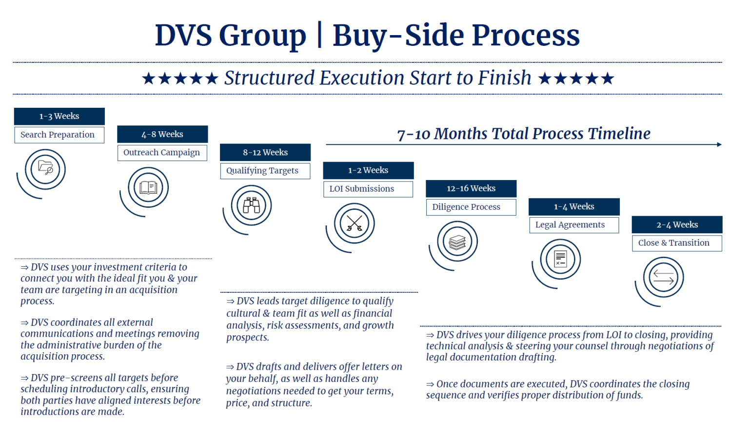 DVS Group was born as a buyside firm and our expertise in generating proprietary deal flow for our clients is deeply embedded in our DNA. Our proprietary buyside process focuses on sourcing proprietary opportunities through research and intentional, crafted messaging. Our buyside services are comprehensive – helping the development of a client’s acquisition strategy, researching targets, managing proprietary outreach, managing communications with and prioritization of targets, gathering data, modeling target financials, preparing valuation estimates, structuring offers and submitting IOIs and LOIs, negotiating LOIs, managing the due diligence process, managing external accounting and legal advisors, securing bank and other financing, actively participating in all negotiations through closing as well as post-closing deliverables. We are with our clients every step of the way.